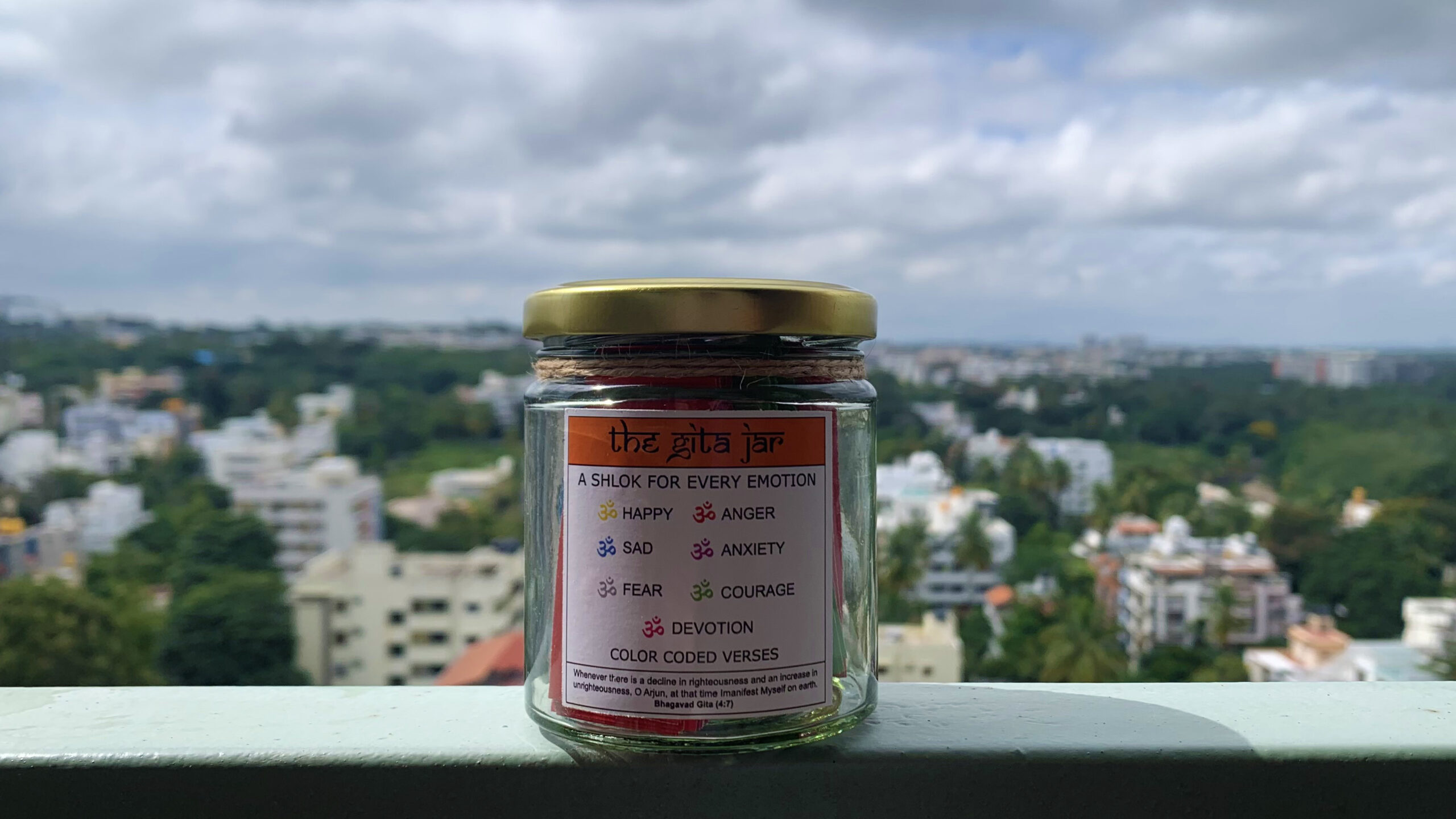 The Gita Jar is a unique product containing 49 different verses, each verse from the Bhagavad Gita. These are divided across 7 emotions—happiness, sadness, anxiety, fear, courage, anger, and devotion.