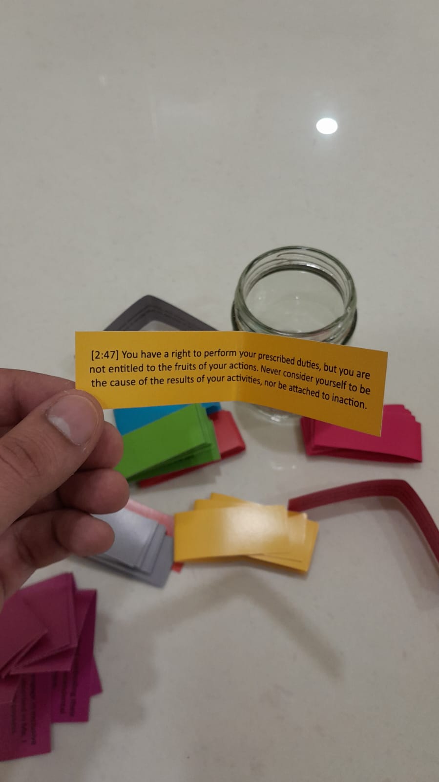 The Gita Jar is an extremely thoughtful concept, I really appreciate this initiative which is useful especially to those who could resonate with summarised version of Gita and also it helps inculcate in our daily life. Thank you very much, I loved it! 🙏🌸